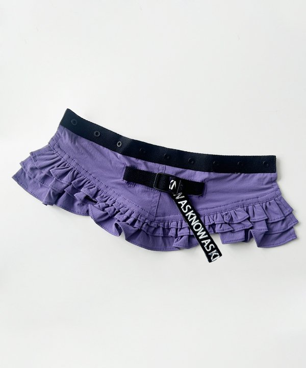 バックルとロゴ入りのベルトがアクセントを効かせるナイロンスカート。