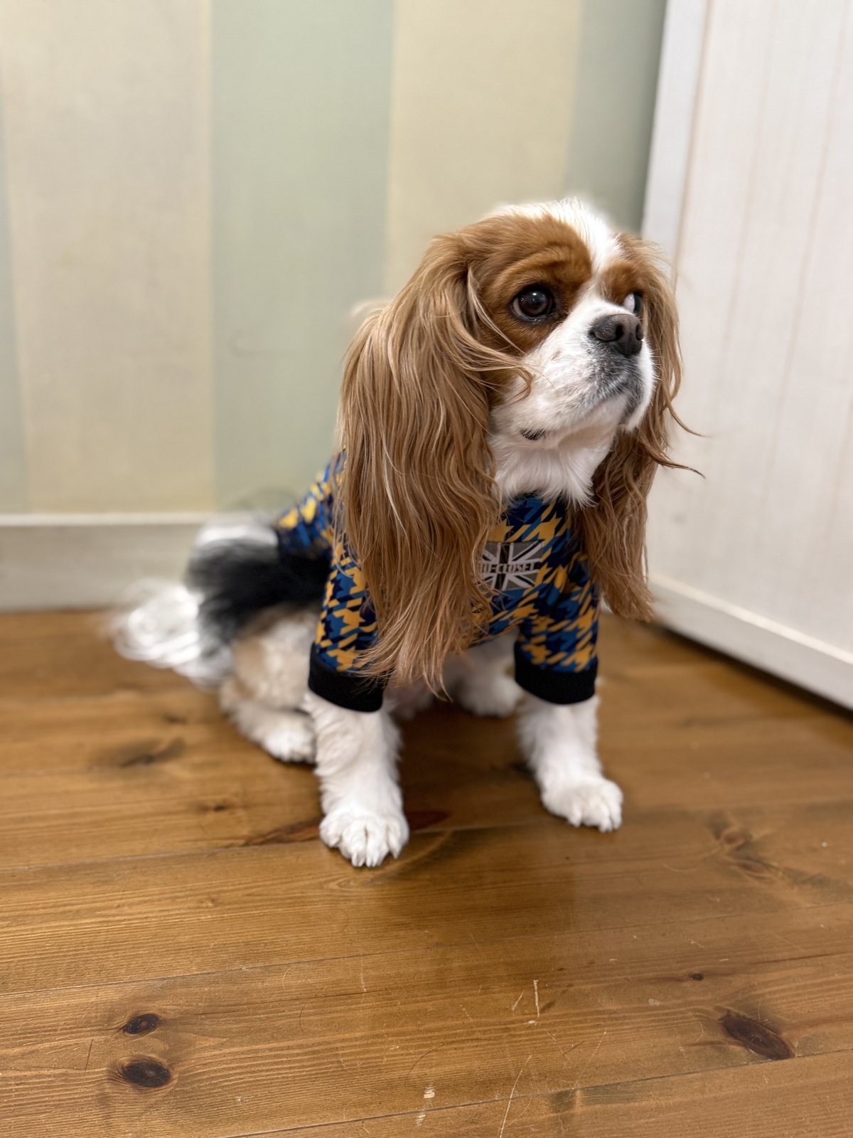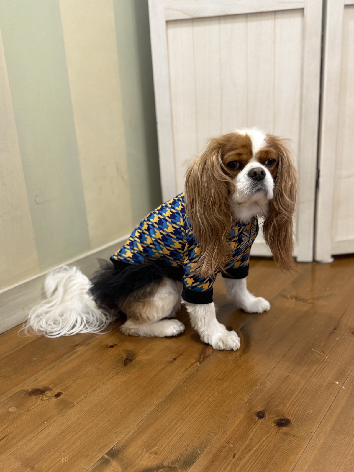 着丈はキャバリア用で少し長めのデザインで、お尻がめくれ上がりにくい仕様になっています。