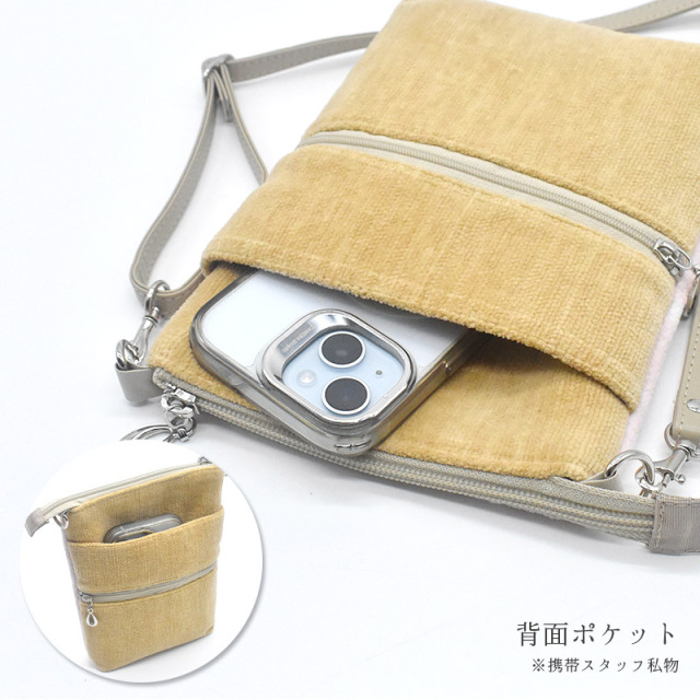スマートフォンの他、ハンカチやティッシュ、小さなお財布まで、お出かけに最低限必要なものがすっきり収まる重宝サイズ。
